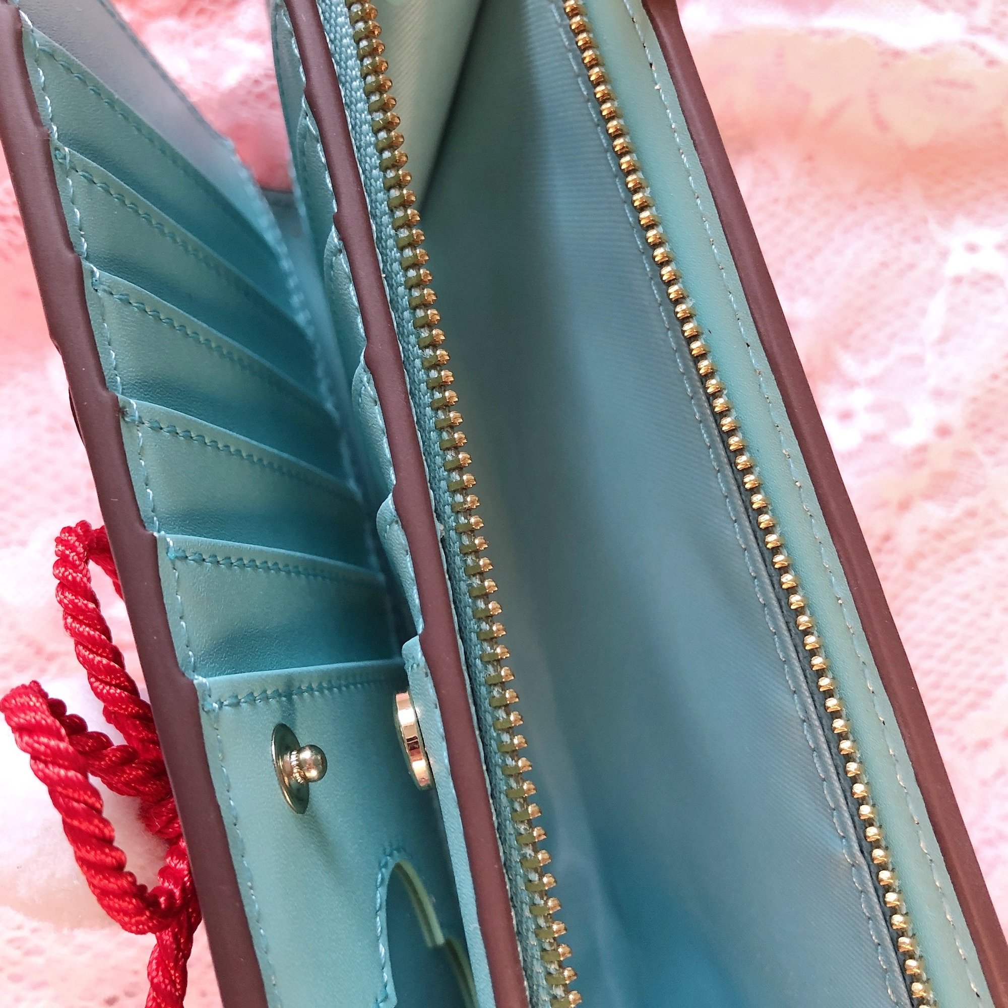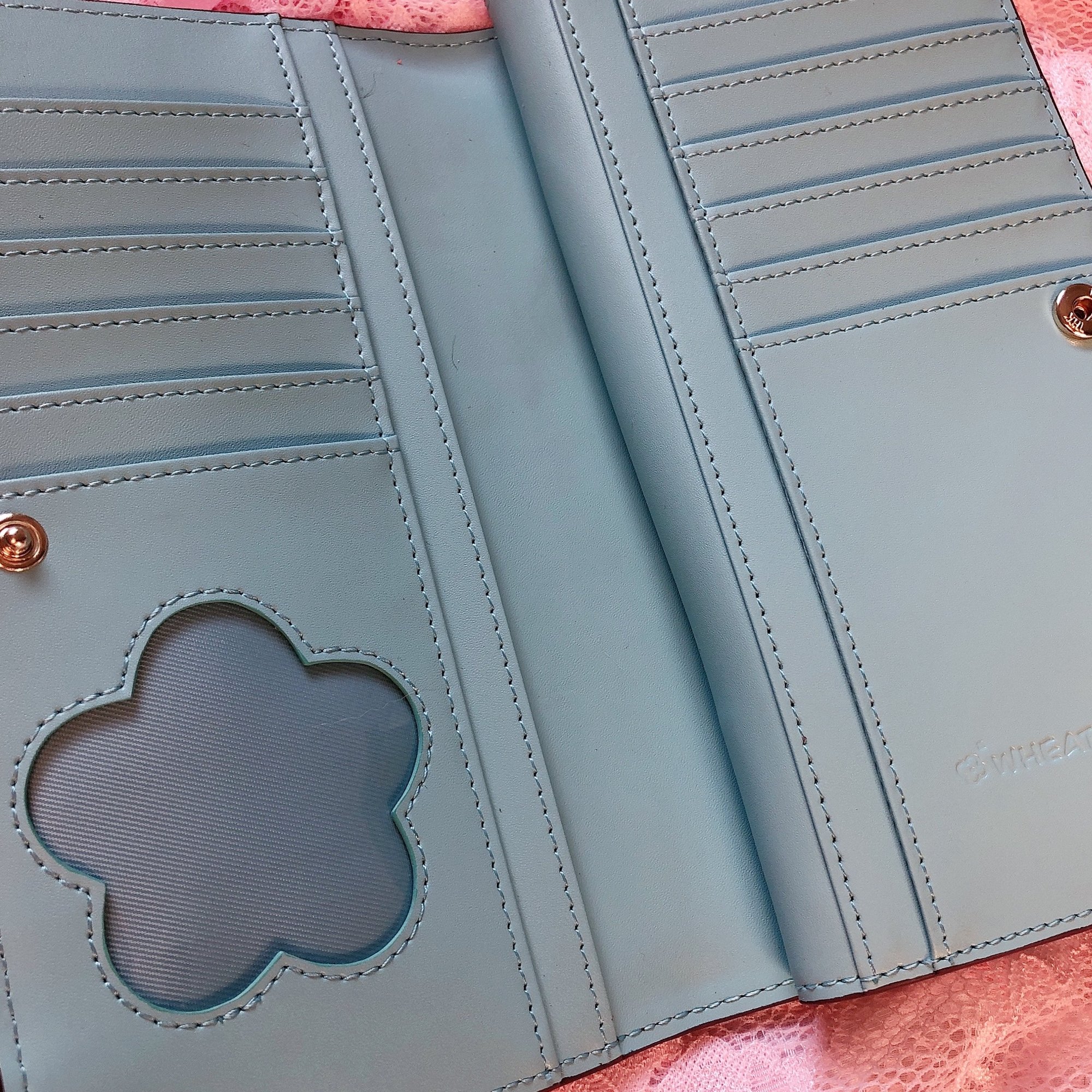 ✦ Soft, cyan interior with flower-shaped ID slot and debossed logo