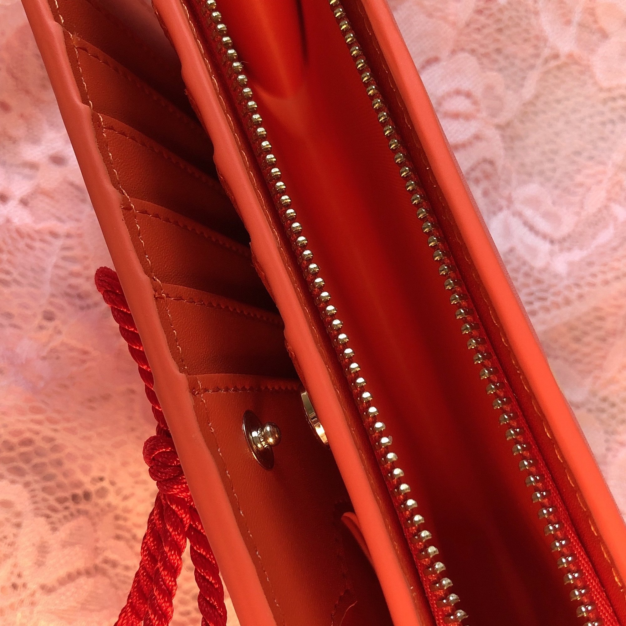 ✦ Soft, clementine orange interior with flower-shaped ID slot and debossed logo